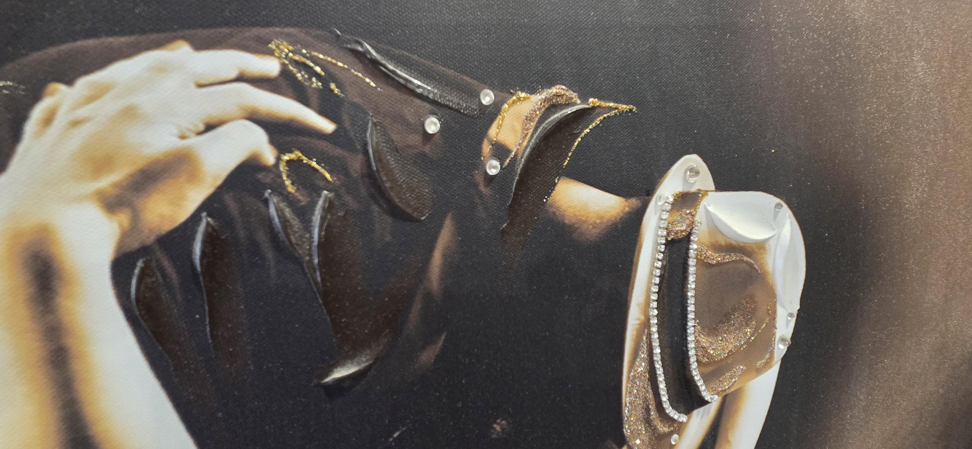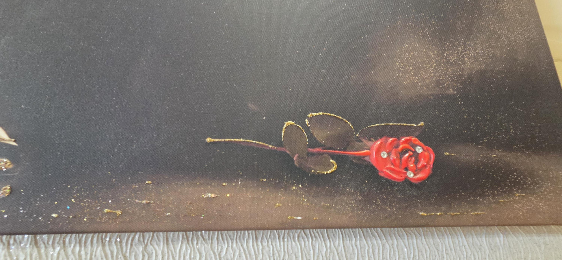 completamente fatto a mano con pennello ad effetto pittorico a sbalzo e rilievo con decorazioni e applicazione di swarovsky e glitter brillantinato , tela pittorica di altissima manifattura cotone /lino incrociato con disegno che gira sul bordo per un effetto immersivo ancora piu' impattante e telaio di abete lamellare aggiuntato levigato per una massima stabilita' trattato per antitarlo e agenti atmosferici il tutto con trattamento vernice damar finale che ne consolida a vita i colori e la brillantezza