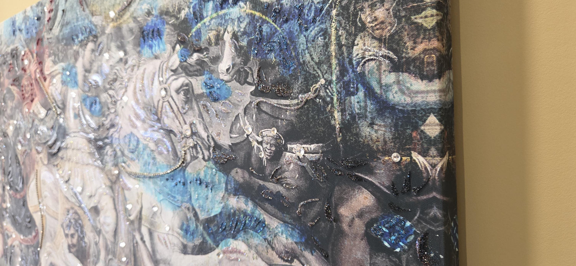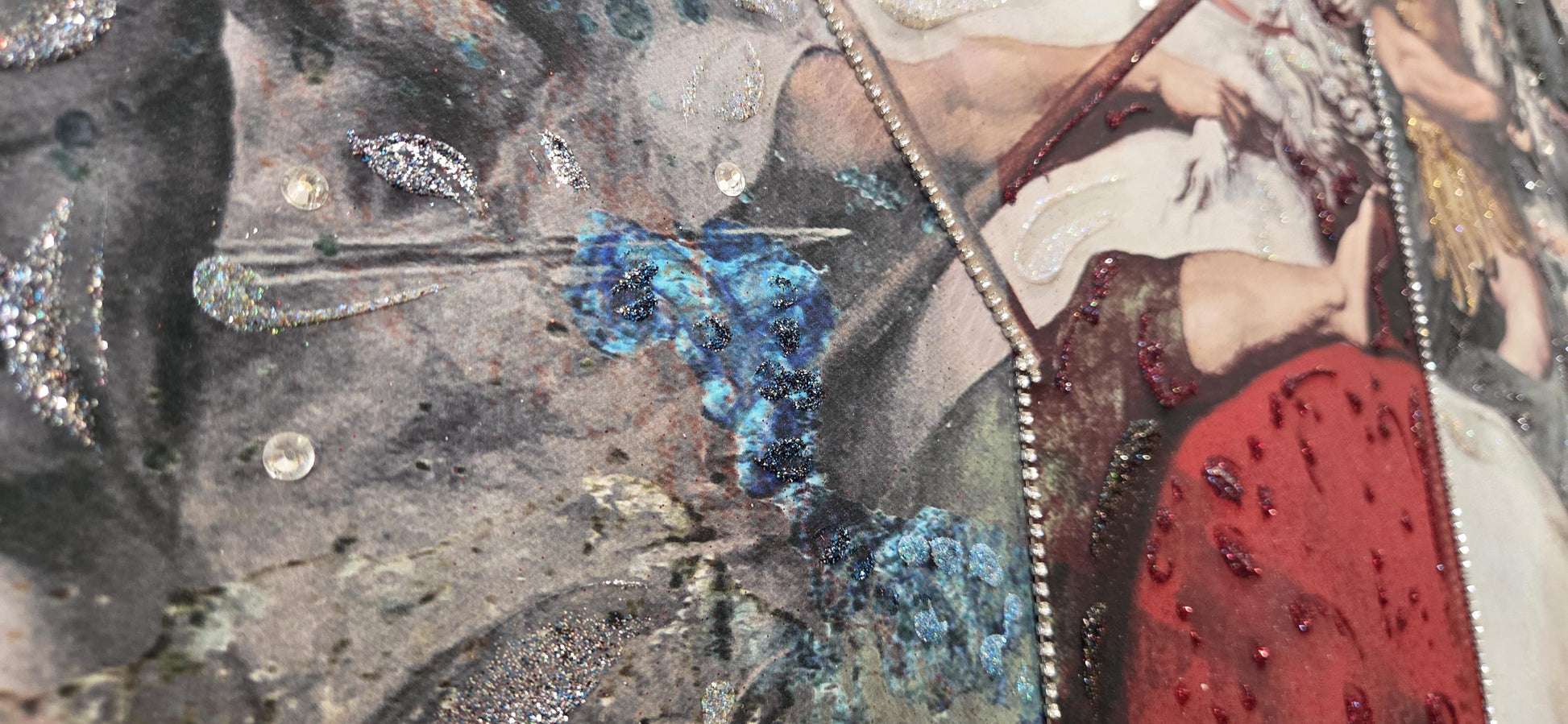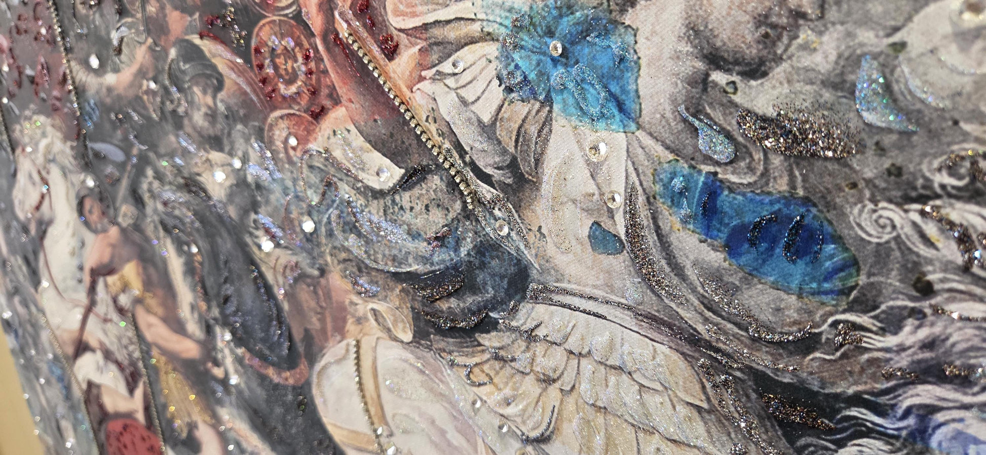 Completamente fatto a mano con pennello ad effetto pittorico a sbalzo e rilievo con decorazioni e applicazione di swarovsky e glitter brillantinato, tela pittorica di altissima manifattura cotone /lino incrociato con disegno che gira sul bordo per un effetto immersivo ancora più impattante e telaio di abete lamellare aggiuntato levigato per una massima stabilità trattato per antitarlo e agenti atmosferici il tutto con trattamento vernice damar finale che ne consolida a vita i colori e la brillantezza.