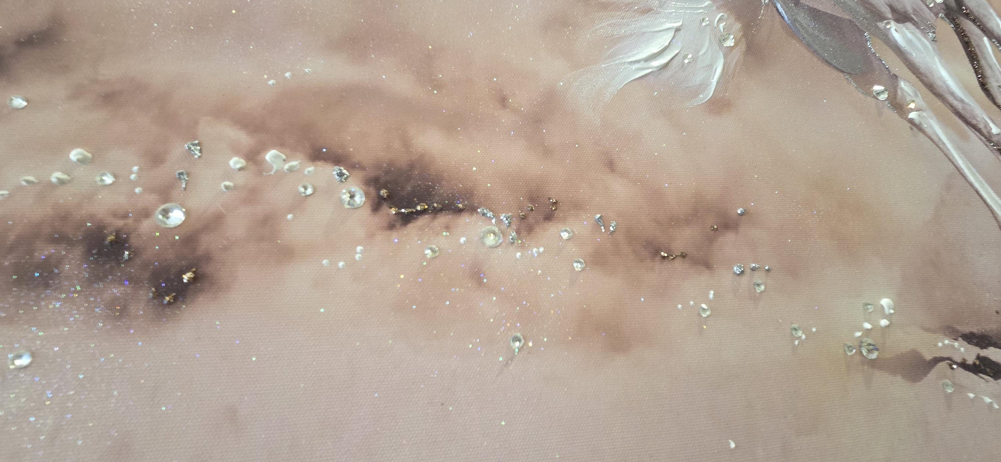 Completamente fatto a mano con pennello ad effetto pittorico a sbalzo e rilievo con decorazioni e applicazione di swarovsky e glitter brillantinato, tela pittorica di altissima manifattura cotone /lino incrociato con disegno che gira sul bordo per un effetto immersivo ancora più impattante e telaio di abete lamellare aggiuntato levigato per una massima stabilità trattato per antitarlo e agenti atmosferici il tutto con trattamento vernice damar finale che ne consolida a vita i colori e la brillantezza.