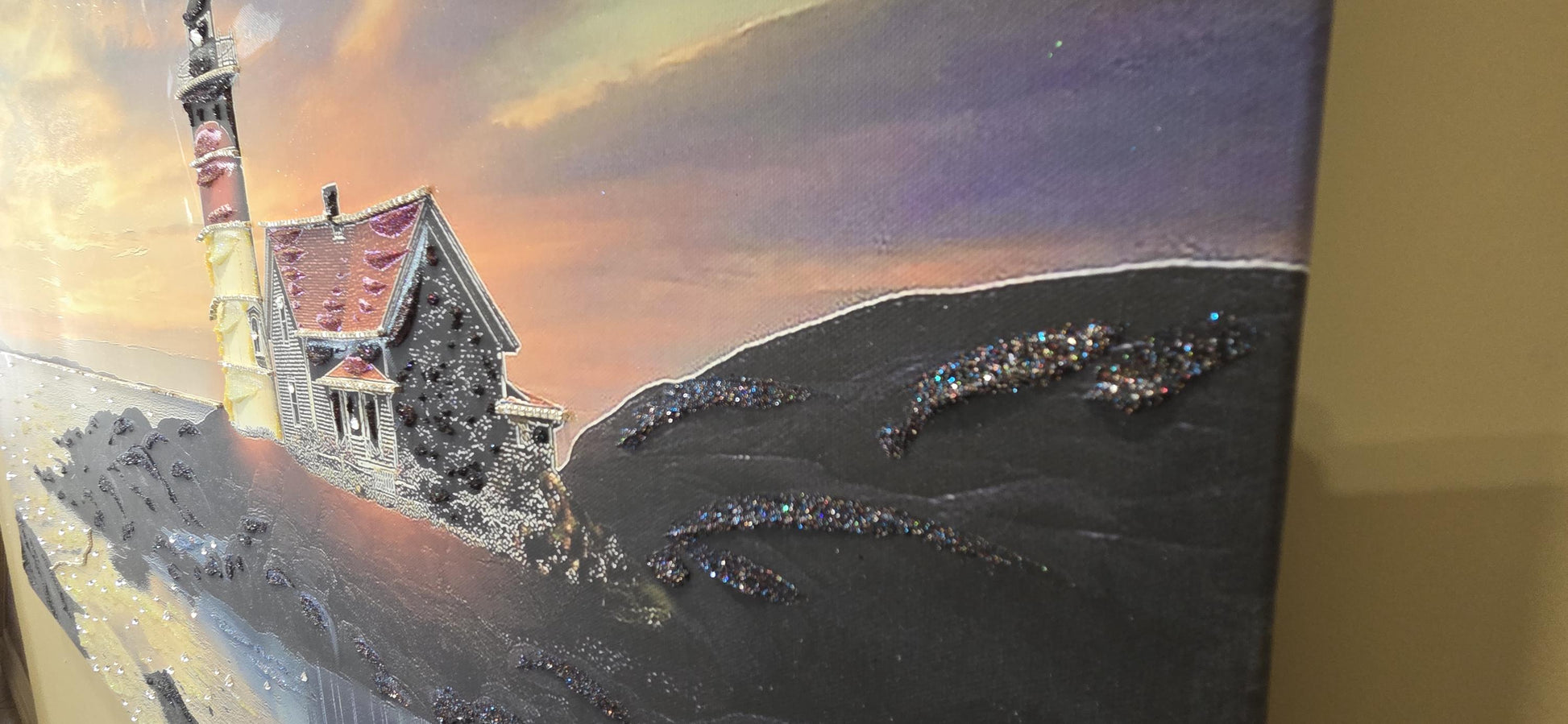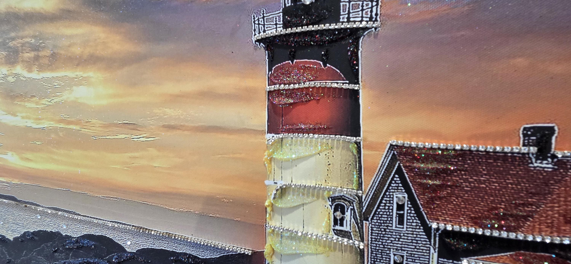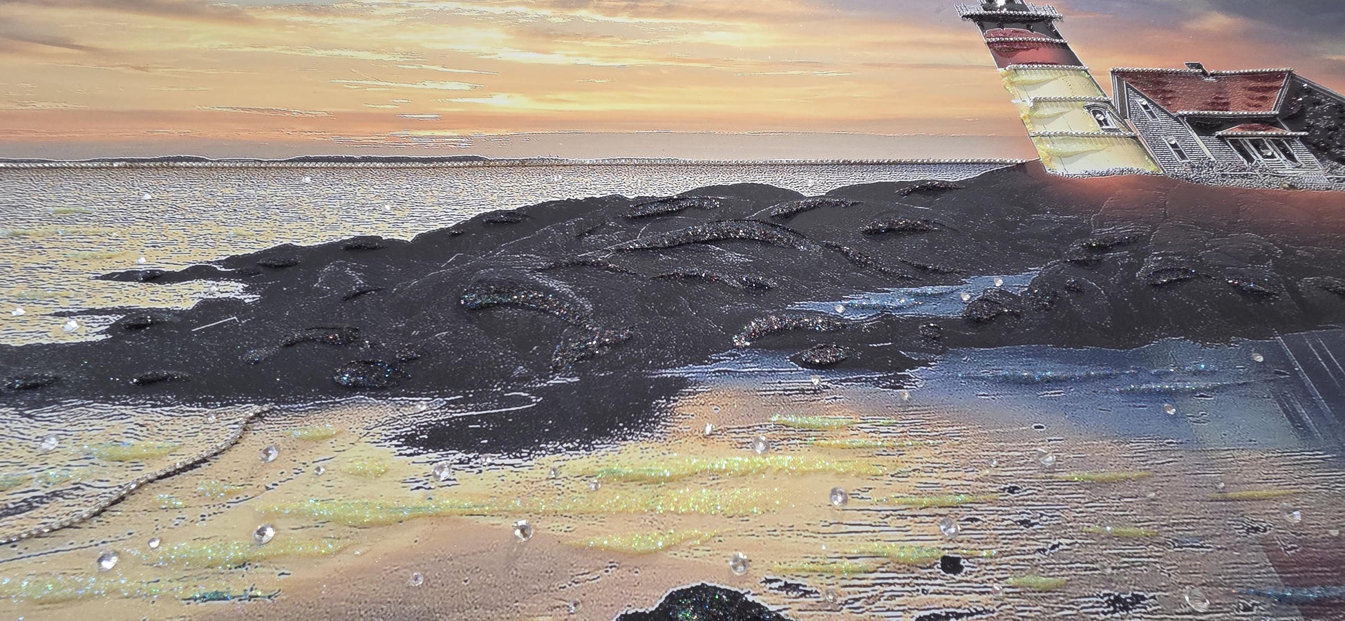 Quadro personalizzabile Faro sul mare su Tela – Pittura Fatta a Mano con Swarovski e Glitter | Arredo casa/ufficio Classico e Moderno