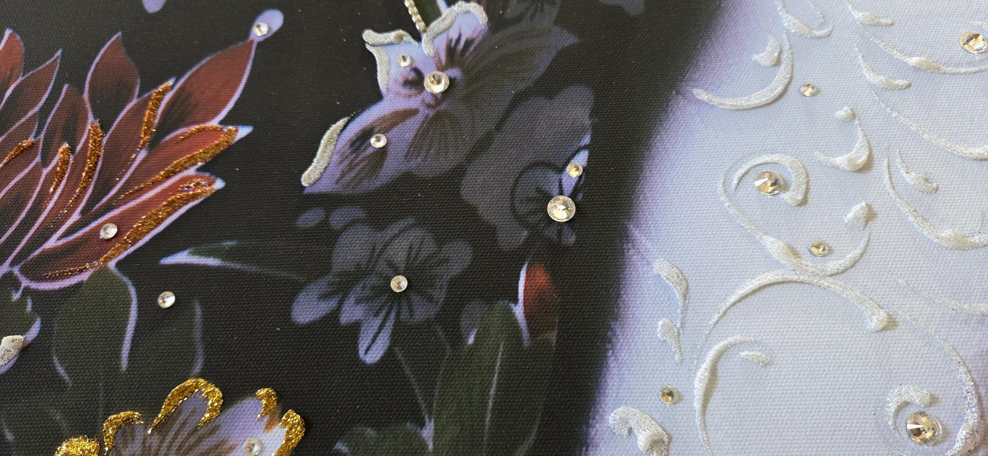 Completamente fatto a mano con pennello ad effetto pittorico a sbalzo e rilievo con decorazioni e applicazione di swarovsky e glitter brillantinato; tela pittorica di altissima manifattura cotone /lino incrociato con disegno che gira sul bordo per un effetto immersivo ancora più impattante e telaio di abete lamellare aggiuntato levigato per una massima stabilità trattato per antitarlo e agenti atmosferici il tutto con trattamento vernice damar finale che ne consolida a vita i colori e la brillantezza