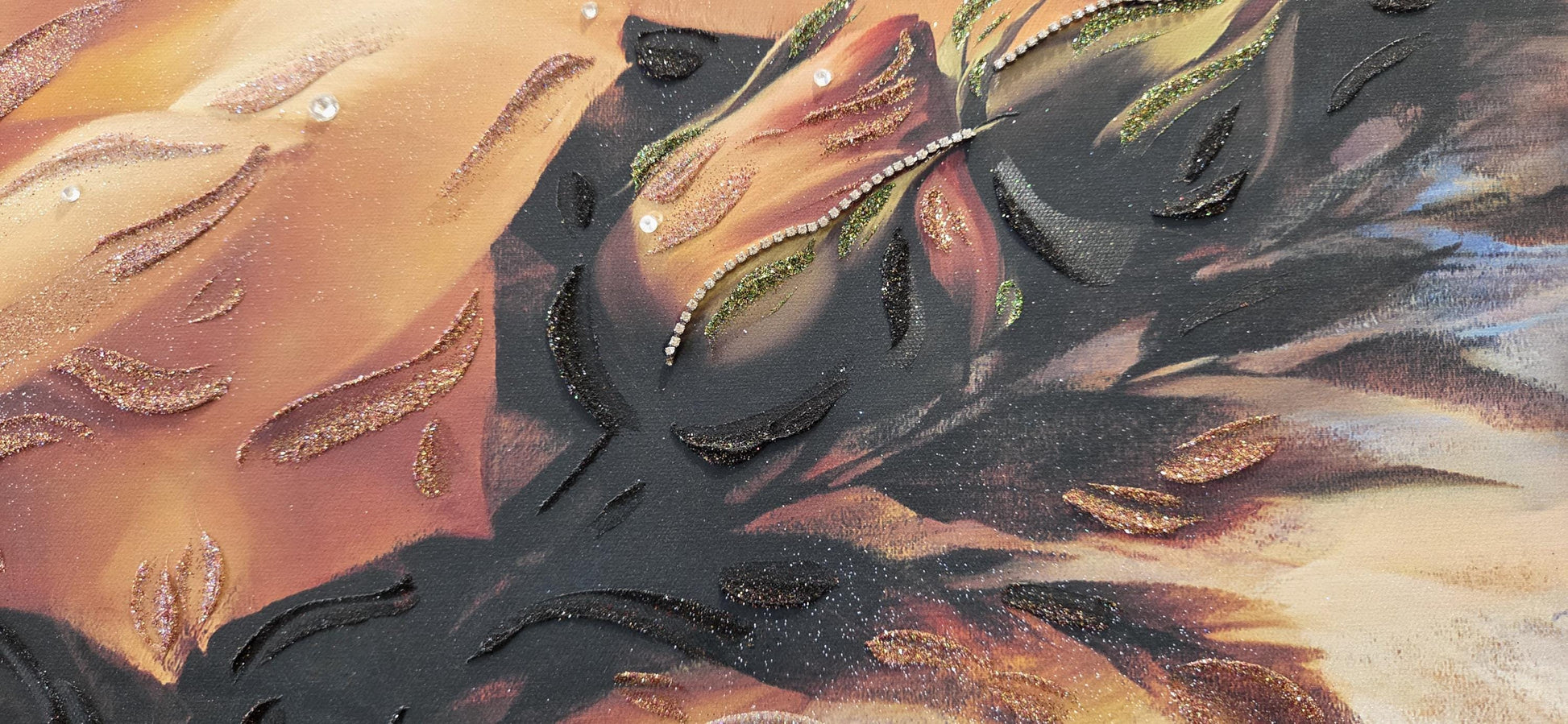 Completamente fatto a mano con pennello ad effetto pittorico a sbalzo e rilievo con decorazioni e applicazione di swarovsky e glitter brillantinato, tela pittorica di altissima manifattura cotone /lino incrociato con disegno che gira sul bordo per un effetto immersivo ancora più impattante e telaio di abete lamellare aggiuntato levigato per una massima stabilità trattato per antitarlo e agenti atmosferici il tutto con trattamento vernice damar finale che ne consolida a vita i colori e la brillantezza